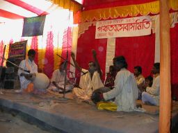 Baul singer I enter another tent, where more Bauls are performing. From these few observations it seems there's a set pattern. There's a principal singer accompanied by two drummers and a few other instrumentalists (cymbals, accordion, violin). The principal singer wears a robe or clothes of silk, whereas the other performers wear normal clothes. For the first song or two all are seated. At some point the principal singer stands and the singing becomes more intense. The two drummers stand also, though they may sit occasionally. The principal singer remains standing until the performance ends. He often holds his arms upwards, sways, and may perform a little dance (sometimes the drummers join in). He sings (drawing out the notes) or recites constantly, with more or less intensity, perhaps telling the audience of the splendor of God and the joy of connection with the divine.