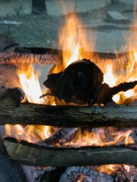 Interesting, the skull is the only part of the body still recognizable. The face is blackened from the flames, but, remarkably, the facial features are still clear. It's as if the person is resting peacefully amidst the flames. The cremation wallahs poke the fire a bit. Later I notice that the skull has split open from the heat, exposing the brain.