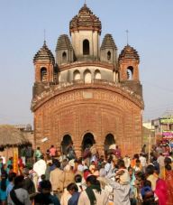 Looks like it's mostly stalls selling pictures of Hindu deities and saints, in particular, Jaidev. He was the author of the Gita Govinda, a book about Krishna, and this place, Kenduli, is said to be the spiritual home of the Bauls. There's a nine-peaked terracotta temple here, built on the site of Jaidev's home. It looks to be pretty old. The facade depicts stories from the Ramayana and the Mahabharata along with a variety of Hindu deities.