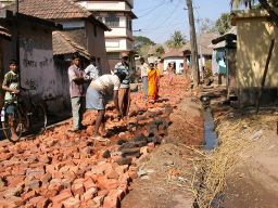 Curiously the lane is undergoing "road making". Or more exactly, about fifty yards of it has been covered by brickbats, making it impassable by rickshaws and very hard to walk over. There is a man with a sledge hammer, whose job it is to pound the brickbats to something smaller. In most other countries they would at least have run the brickbats through a crushing machine before dumping them in the lane, but maybe here they don't know what a crushing machine is. The man with the sledge hammer works slowly, with little effect, and I suspect it will take him months to complete the job. It's hard to imagine a more thankless job. I wonder whose bright idea this is. Maybe someone at the Public Works Dept. had a ton of brickbats from a demolished building. What to do with them? "Say, let's dump them all down some back lane and let the locals worry about them." Certainly the monsoon, six months from now, will turn this dirt lane to mud, but to dump a ton of brickbats on it, making it totally unusable, does not seem to me to be an improvement. Maybe they figure that after six months the man with the sledge hammer will have completed his task and the lane will be usable again before the monsoon arrives.