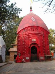 I go down the hill and wander toward a bunch of shrines. This is the social center of the cremation ground. It seems I came in the back way inadvertently. There are men selling incense, and some way off there are huts with sadhus sitting in the doors. A man is trying to tell me about the shrines. One is for Mahakali. Another, all in red, is for Bamakhepa, the mad yogi. I look through the grill and see a picture of Bamakhepa on the ceiling.
