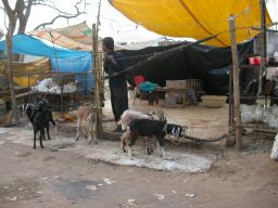 I come to the place selling goats and chickens (actually it's the local butcher shop). There are several goats tethered out front. They like to eat the peel from my mandarins, so I usually give it to them when I buy one. When someone wants some goat meat they take a goat over to the far corner of the shop and slaughter it on the spot, in full view of the goats tethered at the front. Apparently they've recently killed one, since there's plenty of blood on the ground. I ask the man, "Do the goats know they're going to be killed?" but his English is not good enough to understand. Since they can presumably see their companions being slaughtered, one would think they'd know. But they show no sign of anxiety at their impending deaths. They're just being goats in the usual goat way. Maybe a goat just doesn't have a concept of death, at least, not its own death.