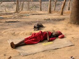 Sleeping sadhu I wander over to the black ash-heap where they perform the cremations, but there are none today. I take some photos, talk to some Bengali tourists — whole families in their Sunday best wandering through the cremation ground. I take a photo of a sadhu sitting in the door of his sadhu house, and offer ten rupees at his altar. He says a prayer for me and puts the red mark on my forehead.