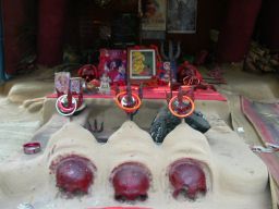 Shiva altar As I leave I give the few rupees I have left to the beggars at the gate, and proceed back down the main shopping street. I'm accosted by a bunch of girl beggars. They're a nuisance, but I'm happy to buy them some food if they'll take it. They will. They want meat. I buy each of the five girls and a couple of old women a sausage each (costs three rupees apiece). I go on, but three more beggar girls run up; apparently they missed out on the sausage. So I buy five more (two more girls, an old man and a sadhu have since joined the begging party) but some of the girls don't want sausage. They don't want fruit either. What they want is potato chips, so I buy a bag at ten rupees for them to share. As I reach the main square three boys come up and start begging, so I buy them (it's now five) a large biscuit each (they really wanted an egg). I can't say I'm overly generous, having paid only about fifty rupees, one dollar, for some snacks for about fifteen people, but they were all pleased to get what they got.