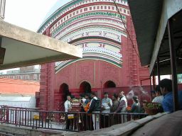 I go out about 2 p.m., and eat a mandarin for lunch (that's a fruit). I head down last night's street (which seems to be the main, and only, shopping street in town). I come to the main temple, pay ten rupees for a cup made from leaves and containing offerings (flower, cake, incense), leave my thongs and enter the temple grounds through the gate. I see the temple, looks like terracotta above and stone below, but maybe all terracotta; the bottom half is painted a deep red. I'm directed to the queue of people, all carrying their offerings, waiting to enter the temple.