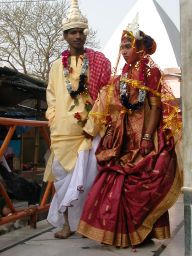 Outside I look around and take some photos, including some of a wedding couple. As I leave the temple grounds there's the usual throng of temple gate beggars. I give a few rupees to some women. One young girl, about eight years old, grabs my hand as I'm putting a coin into an old woman's bowl, and tries to wrench the one-rupee coin from my fingers. Her grip is quite tight, and for a while she might get it, but in the end I make her let go, and I place the coin into the hand for which it is meant.
