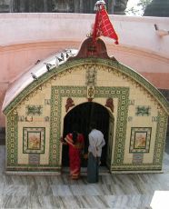 Exit chamber, Kamakhya Temple Outside, Sarma Panda takes me to a small shrine where there is an image of Kamadeva, the god of love (or lust), the Eastern version of Cupid. It's not clear, but he seems to be holding a bow and arrow, just like Cupid. I touch the feet of the god (or rather, the image of the god) and then my head, as is customary in India (it represents bowing down and placing the feet of the god on one's head as a sign of respect). Sarma Panda now suggests that this is the time to pay him, and I give him 101 rupees, with which he is satisfied. He then takes me to the place where it's customary to break a coconut on a stone (there is some sort of shrine here), which he does for me. He then puts the two coconut halves in a plastic bag along with the candy (now prasad) and the two flower garlands. Everything is now completed, and Sarma Panda leads me down along the avenue of stalls to the bus stand (on the way I buy a postcard and poster with images of Kamakhya) just in time to catch a (packed) bus back into town, with Sarma Panda smiling and waving goodbye.