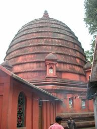 The tuk-tuk climbs the steep road up the hill to the Navagraha Temple. At the stalls in front of the temple gate I buy some offerings (incense, a flower garland and a small ghee lamp) and leave my boots and socks. The temple is an octagonal building, not large, covered by the usual Assamese beehive-style cupola. Images of deities are set in shallow alcoves on the outer walls.
