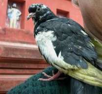 Pigeon I wander around the outside of the temple taking photographs, and deposit the pigeon on a platform of brick and earth, where it seems content. Is it pleased to be out in the open air after being inside the dark and smoky temple? Hard to tell.