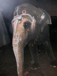 Temple elephant The sun has set. The temple looks interesting, and I go inside along an aisle flanked by railings, but at the inner door I'm told that non-Hindus are not allowed to enter.