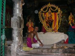 As I'm walking toward the main part of the temple I'm adopted by a man, S. Selvamani, who proceeds to act as my guide. He's actually quite informative, and leads me around the temple complex pointing out various shrines and other noteworthy things, such as the ancient mango tree. I enter a Ganesh shrine; the brahmin priests do their thing, put the red mark on my forehead, and I leave ten rupees. S. Selvamani takes me inside the temple, and we walk around in an area where there are many carved columns lining long aisles. We go into a shrine dedicated to Shiva as Nataraj. There are two brahmin priests there, and there's another short ritual and prayers. They give me two seeds from the mango tree to eat, and place more red and white marks on my forehead. Then it's money time again. Initially I offer twenty rupees, but eventually they persuade me to leave a hundred (US$2) — it's for all the pujas they do, morning, noon and night. A brahmin's work is never finished!