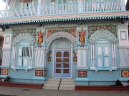 I walk on and come to a large space, open to the outside along one side, and with dozens of thick columns ornately decorated. Along the opposite side are numerous paintings, mostly of Hindu goddesses. In addition to goddesses which would be known to many Westerners, namely, Mahalakshmi, Kalika Devi, Navadurga Devi and Saraswati, there are less well-known goddesses: Rajarajeswari, Gayatri, Bhuvaneshwari and Mahishasuramardini. All the goddesses are portrayed as richly-dressed and beautiful. Curiously, they all seem to have the same face — could it be the face of the then-current maharaja's (main) wife?