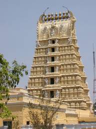 I walk in the direction of the Chamundeshwari Temple, along the usual avenue of stalls, but here as many are selling mundane goods such as bags and suitcases as a selling images of the goddess. The temple has a large gopuram above the front entrance. I enter and come to the entrance to the temple. Non-Hindus are allowed inside, so I join the queue. We come to a railing where brahmin priests are taking the pilgrims' offerings into the inner sanctum where there is an elaborate image of Chamundi. They return with a tray containing a lamp; the pilgrims pass their hands over its flames and touch their heads. One places a few coins or a small banknote on the tray.