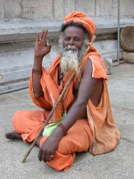 Sadhu Back at the main temple there's another sadhu, looking somewhat scruffy and emaciated, but cheerful. He gives me a flyer which shows a temple being constructed somewhere ("his temple" of course) and requests money. I give him twenty rupees and take a couple of photos of him sitting cross-legged and holding a Shiva trident, obviously having just entered a state of samadhi in which his consciousness has become one with the divine Shiva consciousness. Then it's back to the main square and the bus stand. I catch a bus back to town.