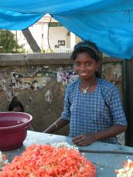 Flower girl In the street outside the bus station vendors are selling fruit and flowers. There's a charming girl selling flowers; I buy a length of threaded small white flowers (she asks twenty rupees, twice what an Indian pays, but accepts fifteen) and I take some photos of her, much to her delight.
