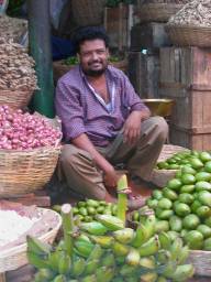 Vegetable vendor I discover that room service offers milk shakes with icecream. With memories of the delicious pineapple milkshakes with icecream that I had in Kanchipuram I call room service to order one. But although room service understands "milkshake with icecream" they do not understand "pineapple milkshake with icecream". A hotel boy comes to the room to find out exactly what I want. I show him the item on the room service menu, "milkshake with icecream" (he probably doesn't read English anyway), and say I want a pineapple milkshake with icecream. But he does not understand. So I settle for a simple "milkshake with icecream". He returns soon after to say with a smile that he will be bringing it "in just ten minutes, sir".
