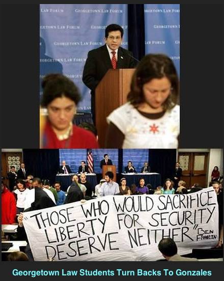 [U.S. Attorney General] Alberto Gonzales spoke before law students at Georgetown Law School today [2006-03-07], attempting to justify illegal, unauthorized surveillance of US citizens, but during the course of his speech the students in class did something pretty ballsy and brave. They got up from their seats and turned their backs to him.