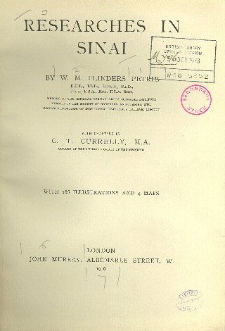 Chapter VII The History and Purpose of the Temple Chapter IX The Lesser and Foreign Monuments Chapter XII The Revision of Chronology Chapter XIII The Worship at Serabít El Khadem Chapter XIV The Conditions of the Exodus The text given in these web pages was scanned from the original 1906 edition of Flinders Petrie's Researches in Sinai, John Murray, London (title page above left). Chapter XII was put into HTML by Peter Meyer in April 2000 CE and the rest by him in February/March 2001 CE. Material in [square brackets] in the text is Flinders Petrie's.