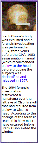 Is this, then, what happened? Did Olson tell the British psychiatrist/SIS agent Sargant that he wanted out of the mind-control project, and that his conscience might compel him to reveal publicly what the intelligence services had been doing? Did Sargant then pass this on to SIS, who in turn told the CIA? Was a decision then taken to make certain that Olson never talked by destroying his memory with drugs and, when this failed, by murdering him and making it look like a suicide?