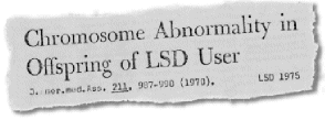 "New research finds [LSD] is causing genetic damage that poses a threat of havoc now and appalling abnormalities for generations yet unborn."2Yet, by the mid-1970s, the tide had turned and the scientific literature generally supported the revised opinion that LSD does not cause chromosomal breakage or birth defects.