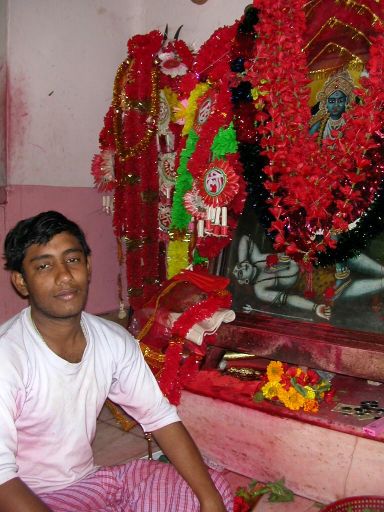 Finally we arrive. I buy some offerings in a little bag made of newsprint and approach the temple. The Rough Guide says that this temple is "unusual in having an oil painting of Kali as its central image", and sure enough there's the picture of the deity. I give my offerings to the officiating priest, who asks my name and recites a prayer, which I imagine requests Kali to bestow her blessings upon me. I get a few pictures of the altar, and leave ten rupees.
