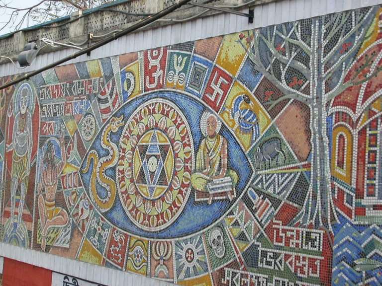 The Ganadevata Express rumbles along, though a more apt name would be the Ganadevata Tortise. After an hour we arrive at Rampurhat railway station, where there is an interesting mosaic illustrating religious themes associated with Tarapith.