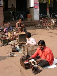 I go to see Chandan at the railway station, leave my rucksack in his office, go to the internet place for a couple of hours, then return in time to catch the train at 4:40 p.m. But I'm told it's 90 minutes late. I read a book. At 6 p.m. I'm told it will be here at 7:30 p.m. It seems the train is coming from Madras, and was held up by a railway workers' strike. Chandan and I go for dinner. I tell Chandan about my boot and he takes me to the shoeshine wallahs at the front of the station. Soon the zipper is fixed! Amazing. Ten rupees only.