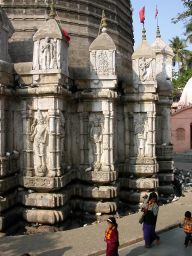 The Kamakhya Temple is a fairly large structure. The oldest part is a structure with several beehive-shaped domes. Around this are several tall columns with carvings of deities. Extending from this older structure is a newer one, around which are panels in which are carved various Hindu deities (including Ganesh) and devas. There are flocks of pigeons, feeding on handouts from the pilgrims, and there are several dogs, cows, goats and monkeys wandering around.