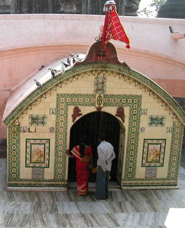 Navagraha Temple Two images of (presumably protecting) deities flank the entrance, and the many visitors are offering incense and small burning ghee lamps in front of them. Inside there's an antechamber with people milling about, mainly trying to sit down in front of an image of Ganesha in an alcove illuminated by many burning ghee lamps. They're reciting prayers and performing arati (moving a ghee lamp three times clockwise before the image of the deity). Eventually I manage to squat down, throw my flower garland onto the heap before the image of Ganesh, light my ghee lamp and place it among the many others already there burning.
