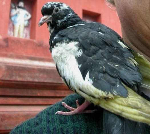 Pigeon I wander around the outside of the temple taking photographs, and deposit the pigeon on a platform of brick and earth, where it seems content. Is it pleased to be out in the open air after being inside the dark and smoky temple? Hard to tell.