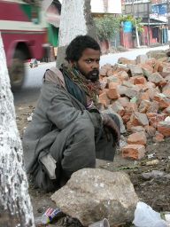 Leaving the museum I go to the place nearby where I saw the poor wretch a couple of days ago, the one sitting before a small fire amidst a heap of stones. He's not there, but there's another man, equally pitiable. He's dirty, dressed in rags and is a picture of misery. I squat down and take a couple of photos. I go over to him, squat down beside him (he has an unpleasant odor) and offer him a 10-rupee note, but he looks at me and disdains it. Nevertheless I place it on the ground before him. I notice that his right wrist is injured, in fact, it appears that a centimeter-wide strip of skin around his wrist is missing, exposing the underlying flesh. This man is in a bad way, and knows it. No wonder that he's not impressed by my offer of ten rupees.