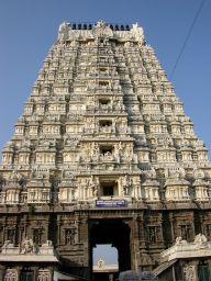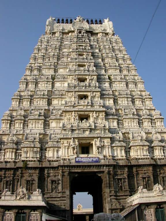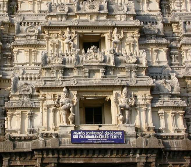 Sri Ekambaranathar gopuram The temple is quite large, with a tall gopuram covered with carvings of gods and heroes. Unlike some other temples in South India, such as the one in Madurai, which is a riot of color, this gopuram is unpainted. Also, curiously, one does not enter the temple by passing under the gopuram, but the entrance gate seems to be more like a side gate into the temple grounds.