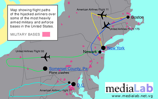>>> In this picture, which is worth even more than a thousand words, MediaLab has merged a map of the 9/11 planes' flightpaths with a map of military bases in those areas. The flights went through some of the most heavily militarized parts of the country, yet nothing could be done to stop them? |