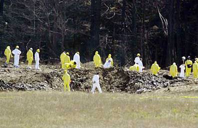 Roving Engine CLAIM: One of Flight 93's engines was found "at a considerable distance from the crash site," according to Lyle Szupinka, a state police officer on the scene who was quoted in the Pittsburgh Tribune-Review. Offering no evidence, a posting on Rense.com claimed: "The main body of the engine ... was found miles away from the main wreckage site with damage comparable to that which a heat-seeking missile would do to an airliner." FACT: Experts on the scene tell PM that a fan from one of the engines was recovered in a catchment basin, downhill from the crash site. Jeff Reinbold, the National Park Service representative responsible for the Flight 93 National Memorial, confirms the direction and distance from the crash site to the basin: just over 300 yards south, which means the fan landed in the direction the jet was traveling. "It's not unusual for an engine to move or tumble across the ground," says Michael K. Hynes, an airline accident expert who investigated the crash of TWA Flight 800 out of New York City in 1996. "When you have very high velocities, 500 mph or more," Hynes says, "you are talking about 700 to 800 ft. per second. For something to hit the ground with that kind of energy, it would only take a few seconds to bounce up and travel 300 yards." Numerous crash analysts contacted by PM concur. |