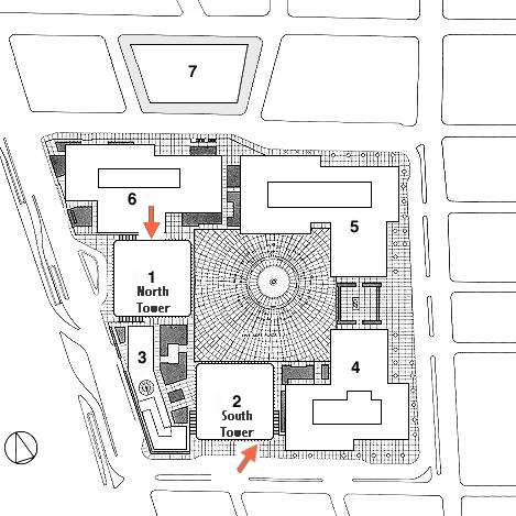When thinking about the attacks on the World Trade Center one should keep in mind the layout of the complex. Here is a diagram showing WTC 1 (the North Tower), WTC 2 (the South Tower) and WTC 7, and the impact points.