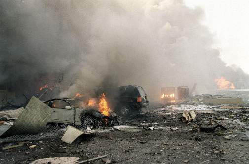 On January 17, 1993, the U. S. Navy conducted a cruise missile attack against the Zaafaraniyah nuclear fabrication facility in Iraq, allegedly because of Iraq's refusal to comply with nuclear inspection requirements. One of these missiles hit the Al Rashid hotel in Baghdad. This missile may have gone off course accidentally, or it may have been intentionally directed at the hotel (a concierge in the hotel said that CNN set up a camera about 30 minutes prior to the attack and then vacated the premises, possibly showing that it had advance warning of the attack). Here is a picture of the oddly squarish entrance hole almost at ground level, and the quantity of debris left on the ground. Remind you of anything? Of course, a missile with a bigger warhead might have done a lot more damage to the inside of the hotel than was done in the 1993 attack. In June 2001, NORAD conducted a military exercise in Florida called 'Amalgam Virgo', a simulation of a cruise missile attack against an American military base. It was NORAD that inexplicably failed to stop any of the September 11 attacks. I leave it to you to draw your own conclusions.