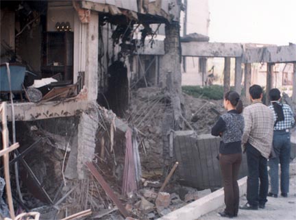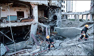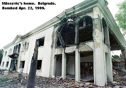 Is this a picture [at left] of the hole in the Pentagon caused when Flight 77 crashed into it on September 11, 2001? How about this? No, but notice the damage caused to the building and the size of the hole and compare it to this picture of the damage to the Pentagon before the Pentagon wall collapsed. The two mystery pictures are from a series of pictures of the 'accidental' attack by NATO on the Chinese embassy in Belgrade on May 8, 1999 (see also this picture from this set). That attack was by three Tomahawk Cruise Missiles, all of which hit the same corner of the building just above ground level. As was the case with the Pentagon, most of the extensive damage to the building was caused by the subsequent fire. Note also the size and neatness of the hole left by a cruise missile attack on Milosevic's official residence (from a series of photos here). I have already made the same point with respect to the 'accidental' cruise missile attack on the Al Rashid Hotel in Baghdad. Anyone who is really interested might want to try to compare the oddly small (in diameter) debris in pictures of the Pentagon with pictures of pieces of cruise missiles found in Serbia (in the Pentagon pictures, click on 'Download high-resolution image' to obtain more detail).
