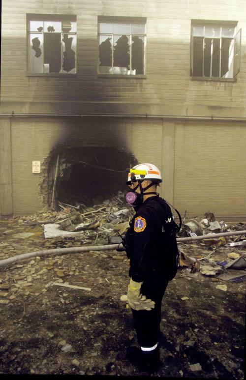 If you look at a this picture of the hole in the wall of the Pentagon that Flight 77 is supposed to have gone through, it is immediately obvious that Flight 77 could not possibly have caused the damage at the Pentagon. We're usually shown pictures of the wall at the Pentagon after it collapsed at around 10:10 a. m., which of course left a much larger opening and completely destroyed all evidence of the smaller hole left by whatever missile actually caused the damage. Just as a camel can't pass through the eye of a needle, and rich men can't enter heaven, a Boeing 757-200, over 124 feet from wingtip to wingtip and, including the tail, over 44 feet (!) high, can't get in to the Pentagon through a hole of this size. Even if the fusilage could get through, how could the wings get through? If the wings didn't get through, shouldn't they be outside on the ground? The only conceivable way the wings could have gotten in is if they collapsed right against the fusilage, but that would require that they be bent back by hitting the building. Although the Pentagon wall has a few cracked and broken windows (and at least some of the windows may have been specially reinforced to resist bomb damage), where is the evidence of metal wings hitting the wall with force (and where is the evidence of the tail hitting above the hole with force?)? The heavy engines should have gone right through the wall. How did the wings pass through this area and leave the vehicles that we can see burning (besides the obvious car, there is a vehicle like an SUV almost obscured by smoke)? Leaving aside the contradictory witness evidence and the completely implausible lack of video evidence, the size of the hole coupled with the relative lack of damage to the wall and the lack of any evidence of the wings is conclusive evidence that Flight 77 didn't cause the Pentagon damage. Some people still say that theories that Flight 77 didn't crash into the Pentagon are some form of clever disinformation, intended to put us off looking at the real truth. The main argument may be that the picture of the hole is of another hole, not the entrance point of Flight 77. We can refute that by reference to the burning car in the foreground. This picture, with the collapsed wall clearly visible in the background, shows the remains of the burning car in the foreground, together with the remains of a burning truck, its paint now burned off (the truck is more visible in this photograph, where you can also see how the ground hasn't been disturbed), that is obscured by smoke (flip between this and this). The collapsed wall now covers where the entrance point was. There is no other collapsed facade on the building (you can see that from this massive [2.27 Mb] picture of the damage to the building), so this must be the area of the crash. You can also clearly see the car and the truck on the left of this photograph, with the hole partly obscured by the pole (you can also see that there is clearly no damage to the helipad or the ground, meaning whatever hit the Pentagon could not have hit the ground first, but went directly in through the hole). Comparing the Pentagon crash to the crash of El Al Flight 1862 doesn't help, as the hole left by the El Al flight is easily big enough and in no way compares with the tiny hole left in the Pentagon before the wall collapsed. My response to people who want to support the Official Story: look at the hole. Are people able to handle a terrorist attack but afraid of the implications of the fact that Flight 77 didn't crash into the Pentagon?